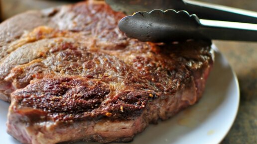 (оставить примерно на час или меньше). Мясо вымыть и тщательно обсушить. 2)Нарезать мясо поперек волокон на куски толщиной 2,5-3 сантиметра. Сделать насечки острым ножом. 3)Смешать растительное масло с черным свежемолотым перцем.Говяжий стейк, зажаренный на сковороде 4)Одну сторону стейка смазать ароматным маслом. Внимание: мясо не солить.