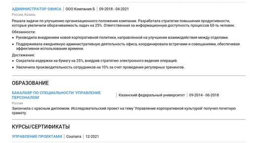 Пример резюме администратора — это готовая основа для вашего успеха. Изучив его, вы сможете составить эффективный документ и получить приглашение на собеседование. ✨ На этой странице представлены готовые примеры резюме администратора для специалистов разного уровня: от начинающих до опытных. Изучив пример, вы сможете создать свое резюме быстро и легко с помощью нашего конструктора резюме. 📄 Заголовок резюме должен быть четким, лаконичным и отражать вашу профессиональную специализацию. Для профессии "Администратор" важно указать уровень опыта и направление деятельности...