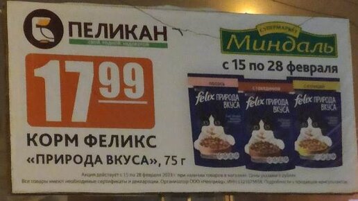 Ожидая зеленый свет светофора на переходе, оглядела я билборды вдоль дороги и увидела художества рекламщиков. Магазин "Пеликан" призывал купить корм для кошек Felix. Производитель на пачке с кормом рядом с названием корма на латинице поместил слоган, написанный кириллицей, ПРИРОДА ВКУСА. Рекламщики ничтоже сумняшеся предлагают покупателю какой-то другой продукт, оформляя "на свой манер": название корма они написали кириллицей Феликс и слоган взяли в кавычки "природа вкуса", превратив его тем самым в название...