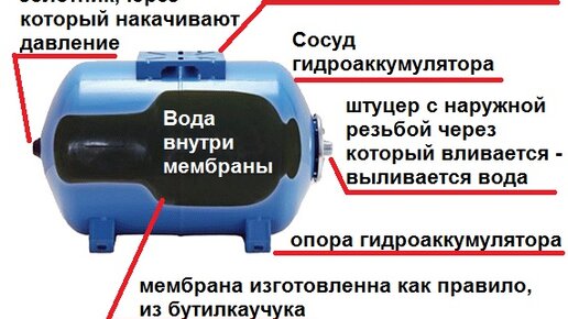 Вот наша система водоснабжения собрана, мы определили давление которое будет в ней, и пришло время её отрегулировать. В первую очередь, необходимо отрегулировать воздушное давление в гидроаккумуляторе. Бытует мнение, что завод-изготовитель всё знает и накачивает давление именно такое какое нужно и ничего там менять не надо, но это не так, ничего завод не знает, а накачивает просто "чтобы было" около 3 атм. Ниже показано устройство гидроаккумулятора. Как видите, мембрана, это не совсем мембрана,...