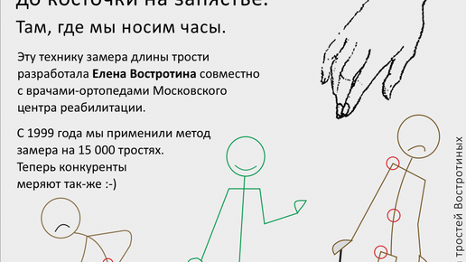 80% покупателей не знают как правильно измерить длину трости. Предлагаем проверенную годами методику Елены Востротиной. Важно. Не используйте готовые таблицы которые предлагают выбрать длину трости исходя из роста. У каждого человека разные и длина рук, и осанка. Трость нужно измерять персонально. Правильная длина трости приносит облегчение, а не наоборот. И так: Это и будет нужный размер. Обратите внимание, что мы режем трость от опорной точки на рукояти до конца наконечника...