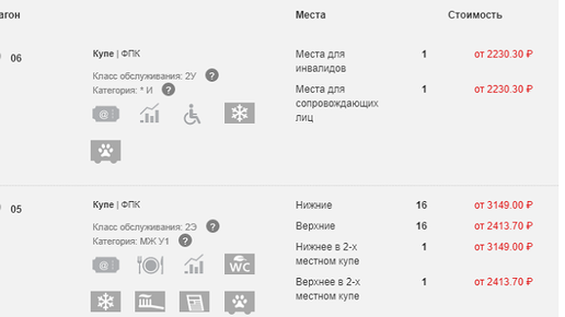 Самое время мне поделиться некоторыми тонкостями покупки железнодорожных билетов. Начнём с того, что с весны этого года выбрать нужный билетна rzd.ru стало проще, Теперь для каждого вагона отображаются пиктограммы, говорящие об уровне комфорта (наличие биотуалета, кондиционера и т.д.). Выглядит это так: При наведении мыши на конкретную пиктограмму она расшифровывается. Также можно подвести курсор к названию класса обслуживания (например, "2Э") и получить полное описание. Здесь же указывается наличие питания, если оно предоставляется...