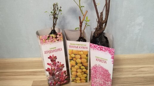 В "Пятерочке" у дома появились в продаже саженцы различных декоративных и ягодных кустарников, а также розы. Цена у них была небольшой и я, естественно, не удержалась. Хотя я все-таки сторонница покупать саженцы в специализированных магазинах и питомниках. Я взяла спирею японскую "Криспа", барбарис "Атропурпуреа" и малину ремонтантную "Золотые купола". Спирея японская "Криспа" Барбарис "Атропурпуреа" Малина ремонтантная "Золотые купола" Конечно, гораздо лучше, если саженцы будут без проснувшихся почек, то есть без листочков...