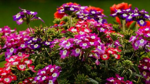 Вербена - шикарное многолетнее растение которое очень просто вырастить на своем садовом участке. В регионах с умеренным климатом растение выращивают как однолетник, так как при минусовой температуре ниже 5 градусов растение погибает. В зависимости от сорта растение может достигать высоты от 20 до 50 см. Разнообразие расцветок просто поражает. Цветы бывают красного, белого, розового, желтого, фиолетового, бардового и синего оттенка. Есть сорта однотонные и с глазками. Цветет вербена маленькими и частыми цветами собранными в зонтики диаметром до 15 см...