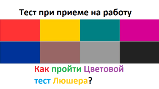 При приеме на работу, службу, учебу, в ЦПД МВД, кроме исследования личности тестами СМИЛ, Равена, КОТ, Кеттела, и др., часто используют цветовой тест Макса Люшера, который представляет собой 8 специальных цветных карточек. По тесту Люшера можно определить нервно-психическое благополучие человека, и его психофизическое состояние. Тестируемому нужно выбрать, разложив в порядке предпочтения (приятности), 8 цветов: синий, красный, зеленый, желтый, фиолетовый, коричневый, серый и черный. Фокус в том,...