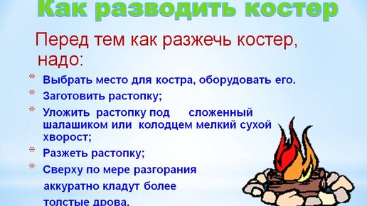 Правила разведения костра в лесу Общепринятые требования к безопасному устройству кострища следующие: Разводить огонь нужно на специально оборудованных площадках. Ликвидация очага должна выполняться тщательно. Запрещается бросать на траву, землю непогашенные спички. При начальных признаках возгорания необходимо правильно его устранить. В случае большого пожара сообщить в службу охраны леса, работникам МЧС. Никогда не нарушать запреты. Это касается пожароопасного сезона, тех мест, где размещены запрещающие таблички...