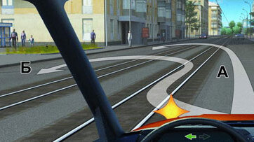 И так поговорим про разворот. Как же правильно его сделать? По какой траектории повернуть? Как не допустить ошибку в ГАИ на простом вопросе? Об этом сейчас и поговорим. Что же мы видим? Участок дороги с рельсами и нам надо совершить разворот. Одна траектория показывает, что надо сначала проехать по рельсам, а другая нет. В билете есть вот такие варианты ответа: 1. По траектории А 2. По траектории Б 3. По любой Поскольку...