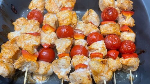 Рецепт куриного шашлыка в духовке быстрый и простой. Отличное угощение на любой вечер. Румяные кусочки курочки получаются сочные и аппетитные, а дополняют их помидоры черри. Куриный шашлык в духовке - рецепт с фото Приготовление Понадобится две куриные грудки, как на фотографии. Нарезаем их небольшими кусочками. Складываем в миску и добавляем быстрый маринад. Ингредиенты в конце описания рецепта. Его нужно совсем немного. Хорошо всё перемешиваем и оставляем на полчаса. Через 30 минут замачиваем деревянные шпажки в воде на на 5 минут...