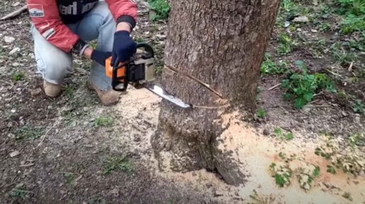 Показываем как спилить дерево бензопилой в нужном направлении, что бы дерево не нанесло урона на участке