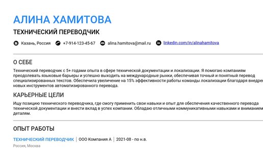 Готовый пример резюме технического переводчика поможет вам увидеть, как правильно структурировать информацию о своем опыте и навыках. Изучение успешных примеров — самый быстрый путь к созданию эффективного резюме, которое приведет вас к желаемой работе. Чтобы вы могли составить эффективное резюме технического переводчика, мы подготовили готовые примеры как для начинающих специалистов, так и для опытных профессионалов. Эта статья содержит подробные пошаговые инструкции для каждого раздела, охватывая: Изучив пример, вы сможете создать резюме с помощью нашего конструктора резюме...