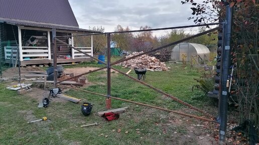 Всем привет! Забор и калитку сделал, теперь выхожу на финишную прямую и забор будет готов. Осталось сделать только ворота. Решил их сварить в одиночку. Выбрал самый просто способ. Столбы для ворот сделал из профильной трубы 80*80*3мм высотой 3 м. Почти метр такого столба пришлось залить в бетон для устойчивости, диаметр заливки 50 см. Расстояние между столбов у меня 503 см. Вроде бы 5 метров для ворот много. Но буквально через неделю от того времени как я их установил. водитель который привозил дрова, так аккуратно выехал, что бортом все равно смог зацепился за столб...