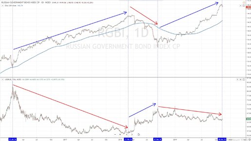 На курс доллара против рубля влияет множество факторов, начиная от политики, заканчивая валютными интервенциями ЦБ, стоимостью нефти и т. д. В конечном итоге, все эти факторы выливаются в то, что изменяется конечное соотношение спроса и предложения на валюту и ее котировки идут в ту или иную сторону. Здесь же я хочу поговорить об индикаторе, который имеет отличную корреляцию с валютной парой и при этом наглядно демонстрирует ее графически - это индекс государственных облигаций. Данный индекс отражает...