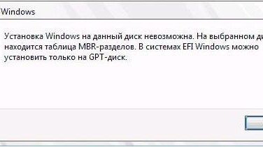 Для просмотра подробностей ошибки необходимо открыть соответствующее окно, где будет выведено следующее сообщение: "Установка Windows на данный диск невозможна. На выбранном диске используется таблица MBR-разделов. В системе EFI Windows может быть установлена только на GPT-диск"...
