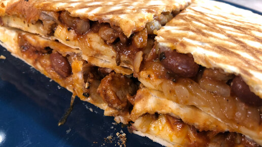 В дело пойдет все, что есть в вашем холодильнике Как-то в поездке попробовал кесадилью и просто влюбился в эту штуку. Самые обычные ингредиенты - мясной фарш, томатный соус, сыр, фасоль… А все вместе просто ОГОНЬ. Однажды попробовал приготовить сам. Во-первых получилось отлично, а во вторых выяснилось, что это очень просто, быстро и очень подходит, для спонтанного ужина. Очень рекомендую парням, которые хотят впечатлить девушку )) Пошаговый рецепт кесадильи Приборы: Сковорода-гриль (простая сковорода...