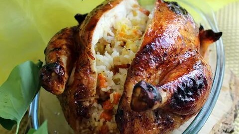 Куриная тушка маринуется в смеси соевого соуса, аджики, чеснока и пряностей, что придаёт ей пикантный вкус и аромат. Предварительно из тушки нужно аккуратно вырезать хребет и грудку. Затем курица фаршируется...