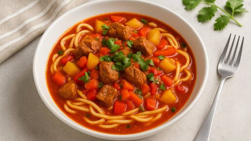 Иногда одно слово уже вызывает аппетит 😋 Кто-то сказал «Лагман» и уже будто слышишь, как булькает соус на плите, чувствуется запах свежей лапши, мяса и специй 🥰 Это блюдо всегда на грани между супом и вторым, поэтому каждый выбирает, каким будет его лагман: погуще или пожиже, чтобы наслаждаться вкусом до последней капли. Лагман пришёл к нам из Средней Азии, и у каждого народа он свой. Где-то лапшу тянут руками, превращая её в длинные ленты, где-то берут готовую, где-то делают густую подливку, а где-то подают как суп...