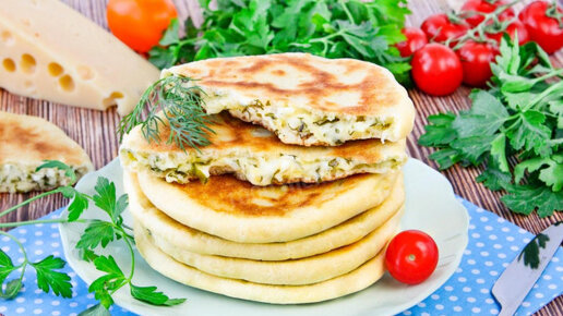 Потрясающе вкусно и очень просто, готовь хоть каждый день! Лепешки с сыром и зеленью жарятся на сухой сковороде из пресного теста на кефире. Процесс приготовления очень простой. Теплые, с нежной расплавленной начинкой они особенно вкусные. Подавать их можно вместо хлеба, в качестве перекуса или просто к чаю. СОСТАВ ДЛЯ ТЕСТА: Яйца- 1 шт Кефир- 250 мл соль- 0.3 чайной ложки Сода пищевая- 0.5 чайной ложки Растительное масло- 1 столовая ложка Пшеничная мука (примерно)- 400 гр ДЛЯ НАЧИНКИ: Сулугуни-...