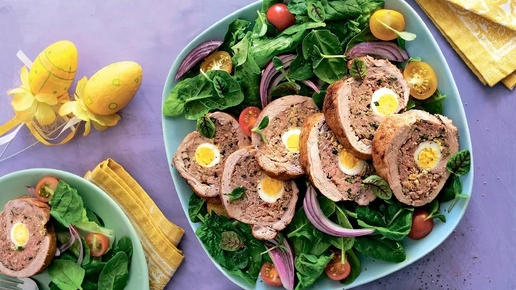 Мясные рулеты хороши тем, что могут сегодня стать главным горячим пасхальным блюдом, а завтра вы нарежете остатки рулета и подадите его как холодную закуску в окружении зеленого салата, например. Готовьте фарш из куска говядины с жирком, так рулет получится сочнее, тем более, что свиная вырезка — сама по себе постная. ИНГРЕДИЕНТЫ НА 8 ПОРЦИЙ 1 кг свиной вырезки 500 г говяжьего фарша 1 куриное яйцо 6 мелких вареных яиц (куриных или перепелиных) 1 луковица 2 зубчика чеснока 2–3 веточки петрушки 2–3...