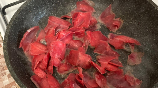 Итак, для начала берем замороженный кусок мяса и немного размораживаем, чтобы резать было удобнее. А также, периодически, опускаем нож в горячую воду, чтобы еще легче было резать мороженное мясо.