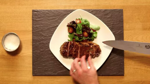 Для приготовления нам понадобится: - Стейк весом около 350 гр. - Растительное масло - Сливочное масло - Морская соль В центр большой, вытянутой тарелки налейте растительное масло и посыпьте его солью. Возьмите щипцами стейк и обмакните мясо в масле, так чтобы оно покрывало кусок со всех сторон. Разогрейте сковороду, примерно в течение 2 минут, и выложите на нее стейк. Готовьте мясо по минуте с каждой стороны. Щипцами возьмите стейк и обжарьте мясо с боков. Продолжайте готовить мясо еще около 3 минут для прожарки medium, или чуть дольше, если вы предпочитаете более прожаренный стейк...