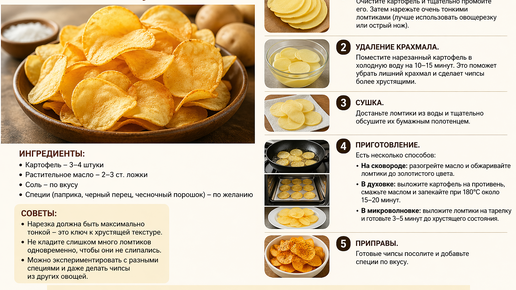 Как приготовить чипсы в домашних условиях Чипсы — это одна из самых популярных закусок в мире. Их можно легко приготовить дома из простых ингредиентов. Домашние чипсы получаются не только вкусными, но и более полезными, так как вы сами контролируете количество масла и соли...