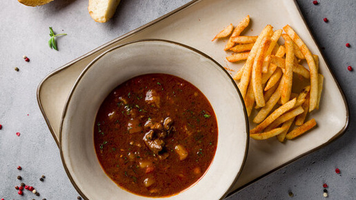 Суп-гуляш с говядиной — блюдо, которое пришло к нам из Венгрии. Когда-то пастухи варили густой, пряный суп прямо на костре, чтобы согреться и восстановить силы. Сегодня гуляш готовят в ресторанах и на домашних кухнях по всему миру, но принципы все те же: хорошая говядина, обжаренные овощи и паприка, которая добавляет блюду сладость и дымные ноты...