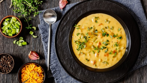 Суп с плавленым сыром — это сытное и ароматное блюдо на основе овощного бульона и обжаренных овощей. В 100 г супа содержится примерно 60 ккал, а время приготовления составляет около 30 минут [1]. Картофель очистите и нарежьте небольшими кубиками. Залейте 2 л холодной воды, доведите до кипения. Затем убавьте огонь и варите 15–20 минут до готовности. Мелко нарежьте лук, морковь натрите на крупной терке. Обжарьте овощи на сливочном или растительном масле до золотистого цвета. Плавленый сыр нарежьте небольшими кусочками...