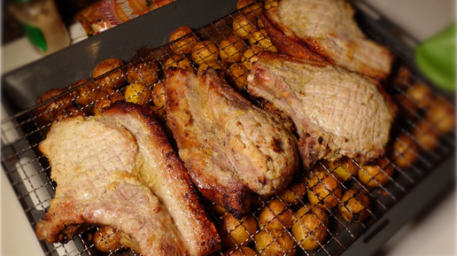 ЗАПЕКАЮ СВИНИНУ с КАРТОФЕЛЕМ В ДУХОВКЕ! #УЖИН #беззаморочек #простой и #вкусный #рецепт Ингредиенты: 1-1,5 кг свиной корейки (у меня стейки на кости) Для маринада: соль, чёрный перец, 2 ч.л. столового хрена, 2 ч.л. горчицы, 1 ч.л. мёда, гранулированный чеснок 2 кг молодой картошки (мелкой) Специи: смесь специй для картофеля, оливковое масло Приготовление: 1. Для начала в картофель отправляем смесь специй и оливковое масло, перемешиваем и картофель на противень в один слой и отправляем запекаться в разогретую до 180°C духовку на 20 минут; 2...