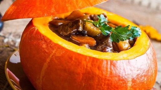 Тыква фаршированная мясом и овощами запечённая в духовке вкусно и полезно все в восторге.