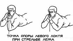 Наиболее устойчивой изготовкой для стрельбы является положение лежа. При этом снайпер должен добиваться устойчивости при минимальном напряжении мышц; удобного положения, обеспечивающего низкую утомляемость; положения головы, при котором будут созданы наиболее благоприятные условия для работы глаза. Положение корпуса при изготовке к стрельбе лежа должно быть свободное, без малейшего напряжения и без перегиба в пояснице. Изгиб корпуса вызывает напряжение мускулов, вследствие его нарушается правильность прикладки, положения рук и т...
