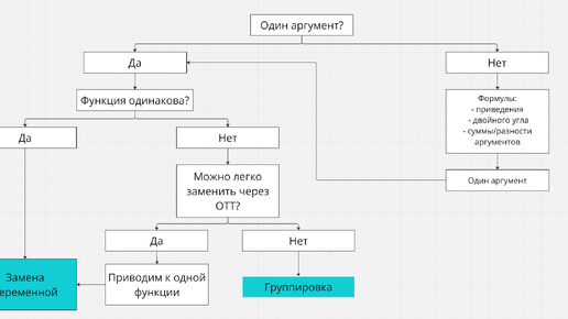 Неискушённый человек глядя на тригонометрическое уравнение не сразу поймёт с чего нужно начинать. Поговорим об универсальных методиках решения. Полагаем, что мы уже знаем как решать простейшее тригонометрическое уравнение и как решать алгебраические уравнения, в частности, группировкой. С чего начинаем? Нужно привести к одному аргументу. Что есть аргумент? Это то, стоит под вашей тригонометрической функцией. Допустим вот. Как приводить к одному аргументу? 1. Формулы приведения. 2. Формула двойного угла (тройной угол не встречал на ЕГЭ)...
