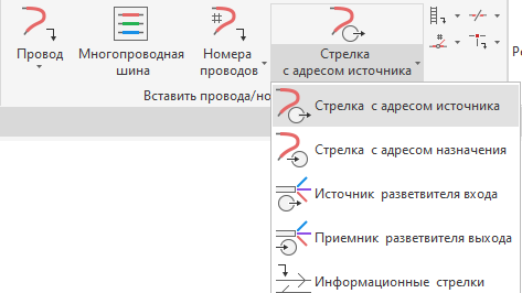Для размещения стрелки с адресом источника цепи необходимо выполнить следующие шаги: 1. На панели «Вставить провода / номера проводов» вкладки «Схема» запустите команду Стрелка с адресом источника. 2. Выберите конец провода (не нужно использовать привязку, достаточно просто подвести курсор к концу провода). 3. В открывшемся диалоговом окне «Цепь — Код источника» в поле «Код» введите текстовый код цепи, который позволит связать стрелки источника и приёмника. Ниже описаны инструменты, доступные в диалоговом...
