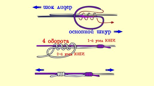 Сейчас многие рыболовы ловят на плетёные шнуры, что конечно даёт много плюсов. Однако такие лески имеют и свои минусы, такие как истираемость о камни и ракушку, отсуствие растяжимости и видимость в воде. Для снятия этих проблем нужно использовать шок-лидер (поводок) из монофильной лески или флюрокарбона. Учитывая большую длину шок лидера - от метра и более, нет возможности его привязывания через вертлюг, ведь такая оснастка не будет проходить через кольца. Поэтому сегодня я сделал несколько схем с описанием самых простых и надёжных узлов для привязывания лески к шнуру...