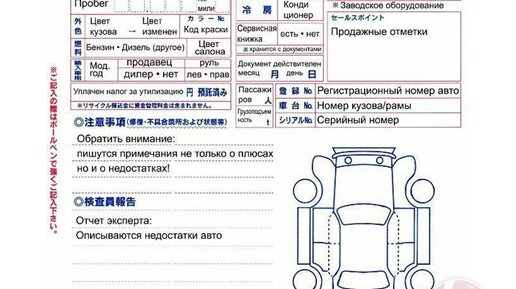 Аукционный лист - это бумага с кучей японских иероглифов и непонятных символов. Мы научим вас это все расшифровывать. Аукционный лист заполняют эксперты при осмотре автомобиля перед выставлением на. В нем детально описывается состояние машины, ее комплектация и все опции, а также указываются все дефекты и выставляется аукционная оценка. Всегда прописывается номер лота и подробнейшие данные об автомобиле – начиная от пробега, его истории и года первой регистрации, и заканчивая перечнем установленного дополнительного оборудования и указанием цвета кузова и салона...