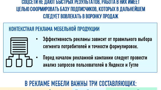 Приобретение мебели – шаг серьёзный. Цель маркетинга в этой области – не просто заинтересовать клиента, но убедить его, что ему нужна именно та мебель, которую предлагает данная компания. В продажах мебели хорошо зарекомендовала себя недорогая интернет-реклама на старте бизнеса...