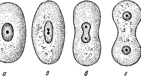 Деление происходит в 5 фаз, давайте посмотрим... Интерфаза Часть жизненного цикла клетки от ее возникновения и до начала следующего деления. Важнейшими процессом при этом является удвоение ДНК, после которого каждая хромосома состоит из 2 идентичных половинок хроматид. Редупликация-удвоение ДНК. В результате редупликаций возникают две одинаковые двойные спирали ДНК состоящие из нити материнской молекулы и вновь синтезируемой нити. В интерфазе увеличивается число многих органоидов. Происходит запасание АТФ для процессов последующего деления и удвоение числа центриолей...