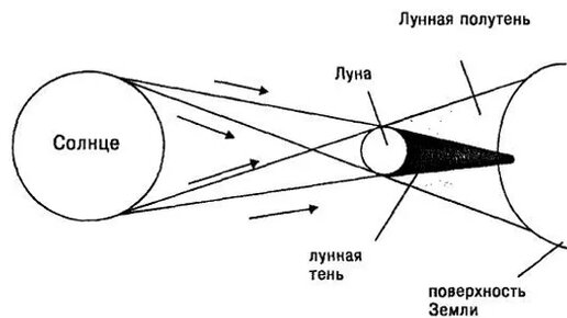 Солнечное затмение происходит, когда Луна проходит между Землёй и Солнцем. В это время Луна обращена к Земле своей неосвещённой стороной, то есть солнечное затмение происходит только во время новолуния. Видимые размеры Луны и Солнца почти одинаковы, поэтому Луна может закрыть собой Солнце. Расстояния Солнца и Луны от Земли не остаются постоянными, так как орбиты Земли и Луны не окружности, а эллипсы. Поэтому если в момент солнечного затмения Луна находится в наименьшем удалении от Земли, то Луна целиком закроет Солнце...