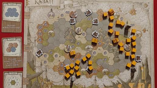 Вчера сыграл еще раз соло в Гильдию купцов-путешественников, но уже по всем соло-правилам, чтобы посмотреть, удастся ли мне пройти хотя бы порог легкого уровня сложности. Если вы не читали мой первый пост про игру, добро пожаловать сюда: Во-первых, я вас немного дезинформировал, друзья! В игре не 8 карт, а 6. Ошибочка вышла! Итак, играл я уже на карте Казан (до этого играл на Авении). Как я уже говорил, на некоторых картах добавляются дополнительные механики. Так вот, на земле Казан во-первых, все места сокровищ пронумерованы буквами...