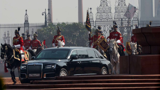 В основной день государственного визита Владимира Путина в Индию 5 декабря прошли российско-индийские переговоры и пленарная сессия совместного бизнес-форума, в которой президент России принял участие вместе со своим коллегой премьер-министром Индии Нарендрой Моди. Официальная церемония встречи, которая сопровождает все государственные визиты, проходила перед Президентским дворцом в Нью-Дели. Там Владимира Путина кроме Моди ждала и президент страны Дроупади Мурму. Aurus на площадь прибыл в сопровождении кавалеристов...