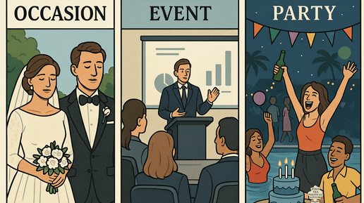 Давайте сегодня разберемся с этими словами. В словаре вы видите, что occasion, event и party переводятся как "событие/мероприятие/праздник/вечеринка". И думаете: "Ну ладно, значит, в принципе, можно использовать любое и они могут друг друга заменять!" 🤷♀️ И иногда это так, но далеко не всегда! В чём же подвох? Эмоциональные оттенки и контекст! ⚡ ✏ OCCASION 🎭 Особенный, значимый момент ИЛИ просто случай ⦁ Special occasion ⦁ Family occasion ⦁ Rise to the occasion ⦁ On occasion (иногда) ⦁ I've met...