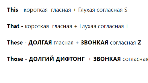 This. That. These. Those. Как отличить This - короткая гласная + Глухая согласная S That - короткая гласная + Глухая согласная T These - ДОЛГАЯ гласная + ЗВОНКАЯ согласная Z Those - ДОЛГИЙ ДИФТОНГ + ЗВОНКАЯ согласная Z This |ðɪs| == эта, это, этот, сей That |ðæt| == то, тот, та, так, до такой степени These |ðiːz| == эти Those |ðəʊz| ==те, тех, теми ================= laxing is processs in English in which tense vowels