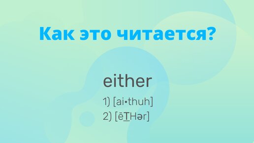 Слово either в переводе на русский означает «любой», «один из двух», «оба», «каждый». Оно также может быть частью союза either… or — в этом случае оно переводится как «или». Кроме того, either может выполнять роль наречия в отрицательных предложениях — «также, тоже»...