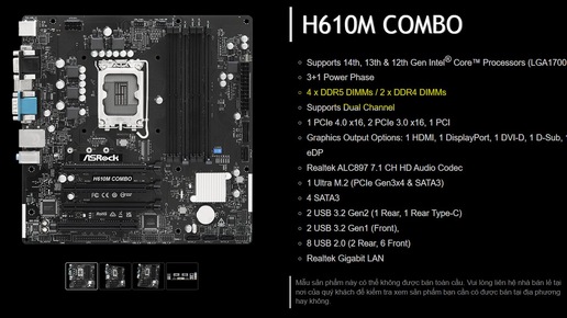 Компания ASRock представила материнскую плату H610M COMBO формата Micro-ATX, оснащённую процессорным разъёмом Intel LGA 1700 (для чипов Core 12-го, 13-го и 14-го поколений). Ключевая особенность платы — поддержка двух стандартов оперативной памяти DDR5 и DDR4. Плата предназначена главным образом для корпоративного сегмента (офисные системы, предприятия и т. д.) и снабжена простой 4-фазной (схема 3+1) подсистемой питания VRM. В дополнение к четырём разъёмам DIMM для памяти DDR5 плата предлагает два слота DIMM для памяти DDR4...