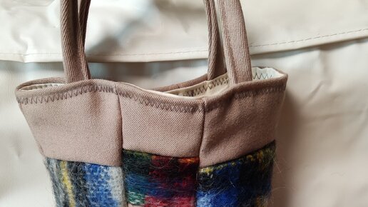 Оставались обрезки от пошива прихваток. Негоже им лежать без дела - всё в ход! Нарезала разного размера квадратов, как получилось. Выкроила полоски для ручек пакета. Складываем каждую полоску вдоль необработанными краями во внутрь и прошиваем. Соединяем выкроенные квадраты сначала в полоски, а затем полоски соединяем между собой вдоль. Складываем получившееся полотно по нижнему краю лицом к лицу. Далее я хотела подкладочную часть тоже выполнить в стиле пэчворк, но только из лоскутков песочной ткани...