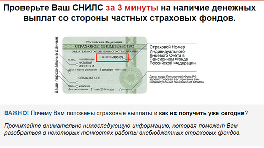 Для начала нужно уточнить, что СНИЛС - это номер индивидуального счета каждого россиянина в Пенсионном Фонде РФ. Это не банковская карта и не банковский счет. Сюда заносятся все данные о стаже и страховых начислениях, которые Вам перечисляет работодатель в счет будущей пенсии. Исходя из этих средств, рассчитывается и назначается пенсия. Ни для каких выплат, льгот, компенсаций этот счет не предназначен. Все предложения проверить положенные Вам выплаты по СНИЛС, найденные в сети интернет на сайтах с громкими названиями фондов, общественных организаций и тп, являются мошенническими...