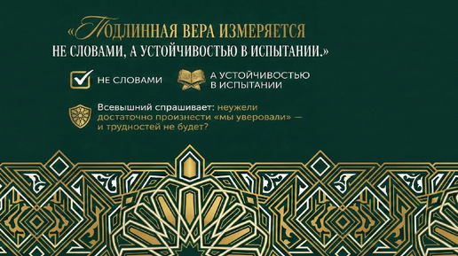 Подлинная вера измеряется не словами, а устойчивостью в испытании. Всевышний спрашивает: неужели достаточно произнести «мы уверовали» — и трудностей не будет? История показывает обратное: каждое поколение проходило свой экзамен. И цель одна — отличить искренних от притворяющихся, найти того, кто говорит правду, от того, кто лжёт себе и другим. Эта статья — разбор трёх онтологических мудростей испытания, укоренённых в аятах 2-3 суры аль-Анкабут, и их применения к четырём ключевым сферам жизни верующего XXI века...