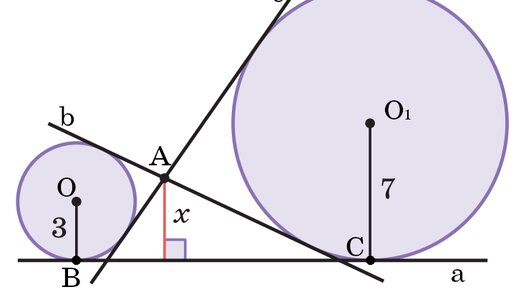 Задача: К двум окружностям с радиусами 3 и 7 проведены одна внешняя и две внутренние общие касательные. Найдите расстояние от точки пересечения внутренних касательных до внешней касательной. ©Математическая Вертикаль. Учебное пособие для общеобразовательных организаций. Автор: М.А.Волчкевич. Решение: Проведём прямую OO1, пусть D - точка пересечения прямой OO1 с касательной a. OO1 пройдёт через точку A, так как обе окружности вписаны в равные вертикальные углы, и их центры лежат на биссектрисе этих углов...
