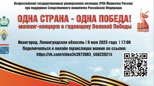 Жителей Подмосковья приглашают присоединиться к онлайн-трансляции митинга-концерта «Одна страна — одна Победа!». Ее проведут 9 мая, сообщает пресс-служба ГСУ СК России по Московской области. Организатор мероприятия — Всероссийский государственный университет юстиции (РПА Минюста России) при поддержке Следственного комитета РФ. Митинг-концерт состоится в Ивангороде Ленинградской области...