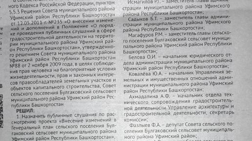 Однажды в Ноябрьский день, а именно 13 ноября 2025 года в местной газете Уфимские Нивы появилось объявление о проведении публичных слушаний. Уфимские нивы от 13 ноября 2025 года. Из указанного объявления, следует, что это Решение № 123 от 6 Ноября 2025 года, за подписью Главы сельского поселения БУлгаковский сельсовет муниципального района Уфимский район Республики Башкортостан сообщается о том, что они намереваются провести публичные слушания в населенном пункте Булгаково Уфимского района...