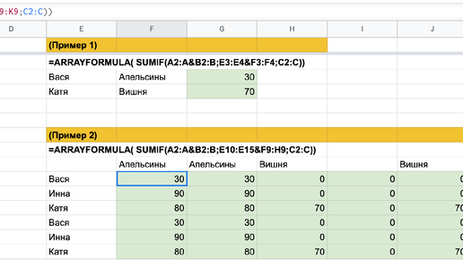SUMIF для нескольких условий в формуле массива